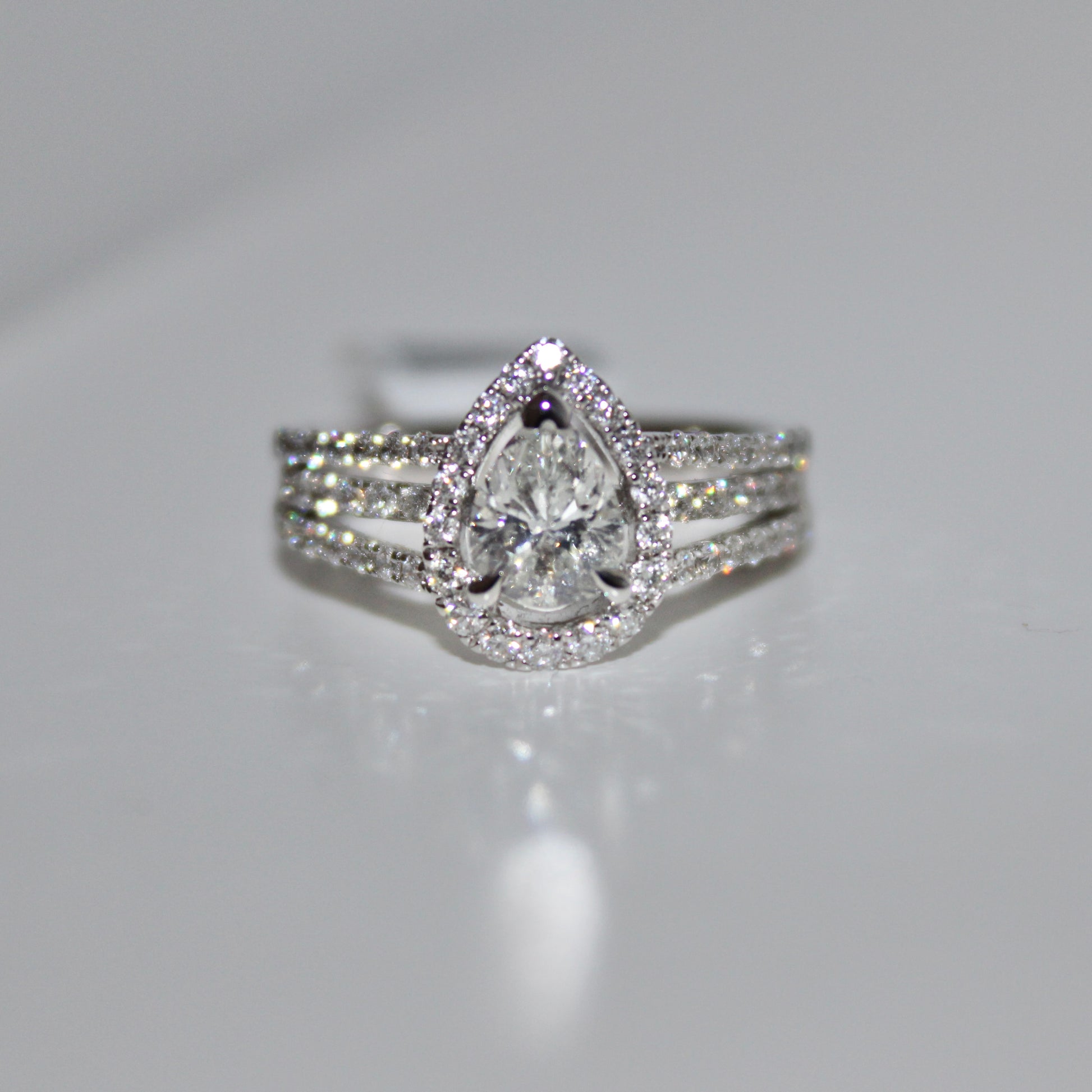 18K White gold ring, featuring a pear shape centre stone set with diamonds on the halo and split should band