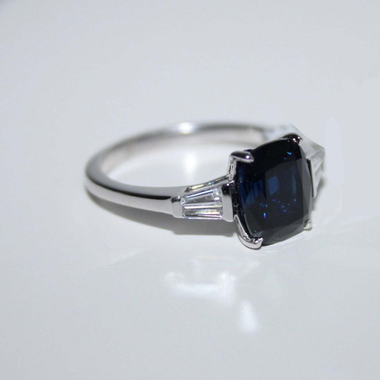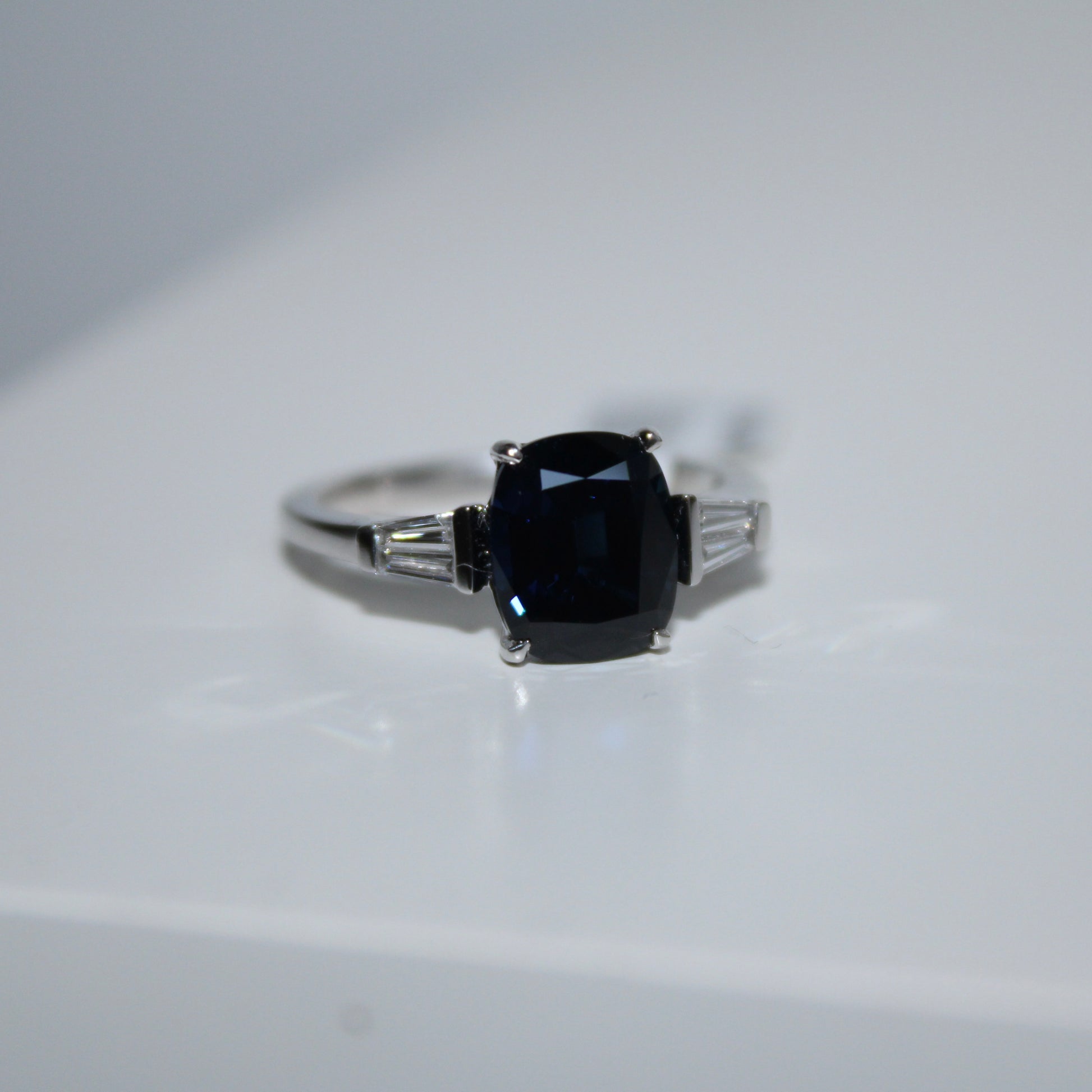 18K White gold Sapphire and diamond ring, featuring a cushion shape deep-blue Australian Sapphire set with tapered baguettes on each shoulder.
